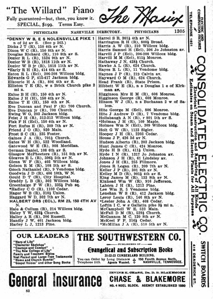 Page of the Nashville City Directory with a portion of the physicians listed. Note the many doctors with only initials. Any of these physicians could be females. The “*” before the name indicated “colored.”