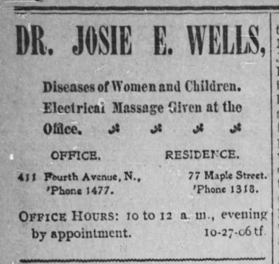 Josie’s practice was open to all, but her specialty was in the diseases of women and children. Josie was a vocal proponent that the number of women practicing in the medical profession would continue to grow and would entirely take over the care of women. The Nashville Globe documented a speech Josie gave to a group of young women on this topic in 1907. “She said that the time would come (not, however, in her day, but that it would surely come) when all women would be treated by her sex in the medical line. She hoped that many of the young ladies would not only go into the medical profession but would find the nurse training profession an agreeable one.” Speaking to a similar group of young ladies in New York City the same year Josie was said to have “captivated” the audience with her “straightforward talk and pleasing manner.” Josie was not a woman to sit and wait for progress. She believed women were the best option for the care of women, because they understood women. Even if she didn’t think she would live to see it happen, she did her best to encourage and support young women who were interested in medicine to become nurses and physicians. She contributed to a dream she hoped would eventually be realized.