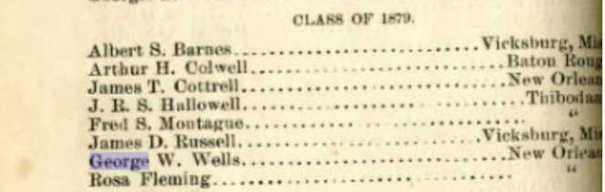 Let’s begin this George journey with the meager facts we initially knew when my research began. Josephine English married George Wells in Holly Springs on April 23, 1894, which was reflected in the court records of Marshall County, MS. Josie’s 1921 obituary stated that “she was married to Prof. Wells of Holly Springs, but he died shortly thereafter.” And finally, a biographical sketch written on Alma Wells Givens by the Journal of the National Medical Association said “Her father was a professor of Latin and Greek at Rust and Straight Colleges.” The 1895-96 Straight University Catalog listed George W. Wells as an 1879 graduate, who was a professor at Rust College in Holly Springs, MS. On a personal level, we could assume that if George was graduating in 1879 from college he was born at least 20 years before that, so about 1859. Census records for Alma through the years listed her father’s birth location as Louisiana, Mississippi and Alabama! I consistently looked for a George Wells born in any of those areas, focusing on Louisiana since that is where Straight University was. That WAS all we knew…until I was thumbing through George’s information in my binder, I noticed a little detail that I had overlooked. A simple detail. A librarian at the Straight University had sent me a list of graduates and where they were from. George Wells was listed in 1879….from New Orleans!