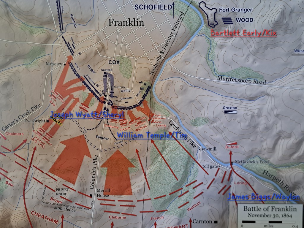 Bartlett Early was a sixteen-year-old boy who enlisted in 1864. At the time he enlisted he knew what was at stake. He was a baby, brave but too young to understand the horrors of war. He would have learned very quickly on the Atlanta Campaign. Bart, mustered into Co. B 19th OH Infantry, U.S. Army. Early, along with his regiment were among the first to arrive in Franklin the morning of November 30th. As soon as the railroad bridge was passable, they evacuated across the river. His division, commanded by Brig. Gen. Thomas Wood, guarded the evacuation of the U.S. soldiers from Franklin after the battle. When the army was safely on the north side of the river Wood’s men set fire to the bridges and made sure they were impassable before proceeding to Nashville. Bartlett Early’s great-great grandson is Kix Brooks.